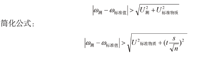 如果實(shí)驗(yàn)室對(duì)標(biāo)準(zhǔn)物質(zhì)的測(cè)量值超出了標(biāo)準(zhǔn)物質(zhì)特性量值的不確定度范圍,是不能直接得出測(cè)量結(jié)果存在偏差的結(jié)論的,原因是標(biāo)準(zhǔn)物質(zhì)的不確定度U標(biāo)準(zhǔn)物質(zhì)僅包括了與標(biāo)準(zhǔn)物質(zhì)定值、均勻性、穩(wěn)定性有關(guān)的不確定度,沒(méi)有涉及用戶在實(shí)驗(yàn)室里對(duì)標(biāo)準(zhǔn)物質(zhì)進(jìn)行測(cè)量有關(guān)的隨機(jī)不確定度U測(cè)。因此,應(yīng)采取以下通用公式判斷標(biāo)準(zhǔn)物質(zhì)測(cè)量值與標(biāo)準(zhǔn)值之間存在顯著偏差: