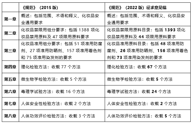 為貫徹落實《化妝品監(jiān)督管理條例》的要求,進一步完善化妝品安全技術(shù)法規(guī)體系,中國食品藥品檢定研究院于2022年3月31日,發(fā)布“中檢院關(guān)于公開征求《化妝品安全技術(shù)規(guī)范》修訂意見的通知”(以下簡稱為“通知”)。此次“通知”附件中 “《化妝品安全技術(shù)規(guī)范(2022年版)》征求意見稿”的構(gòu)架及主要內(nèi)容,與現(xiàn)行的《化妝品安全技術(shù)規(guī)范(2015年版)》對比如下