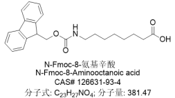 另外,GB 5009.150-2016和SN/T 3843-2014標準中將紅曲紅胺的CAS號3627-51-8寫為126631-93-4,而后者對應的名稱為N-芴甲氧羰基-8-氨基辛酸(N-Fmoc-8-Aminooctanoic acid),對應的結構式見下圖。盡管該化合物的分子式和分子量與紅曲紅胺完全相同,導致二者在一級質譜的分子離子峰完全相同(均為[M+H]+ = 382, [M-H]- = 380),然而二者的化學結構卻差別巨大,因此其核磁譜圖和二級質譜上的碎片離子峰有顯著差別,在HPLC上的出峰時間和UV吸收也有明顯的區(qū)別。檢測人員在標準物質選擇、采購和使用中應多加注意,避免產生錯誤的檢測結果。