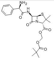 4-Thia-1-azabicyclo[3.2.0]heptane-2-carboxylic acid, 6-(2-amino-2-phenylacetamido)-3,3-dimethyl-7-oxo-, hydroxymethyl ester pivalate (ester), D-(-)- (8CI); 4-Thia-1-azabicyclo[3.2.0]heptane-2-carboxylic acid, 6-[(aminophenylacetyl)amino]-3,3-dimethyl-7-oxo-, (2,2-dimethyl-1-oxopropoxy)methyl ester, [2S-[2α,5α,6β(S*)]]-; 4-Thia-1-azabicyclo[3.2.0]heptane-2-carboxylic acid, 6-[[(2R)-aminophenylacetyl]amino]-3,3-dimethyl-7-oxo-, (2,2-dimethyl-1-oxopropoxy)methyl ester, (2S,5R,6R)- (9CI); Ampicillin pivaloyloxymethyl ester; Hydroxymethyl 6-(2-amino-2-phenylacetamido)-3,3-dimethyl-7-oxo-4-thia-1-azabicyclo[3.2.0]heptane-2-carboxylate pivalate (ester); Pivaloylampicillin; Pivaloyloxymethyl D-α-aminobenzylpenicillinate; Pivaloyloxymethyl ampicillinate |